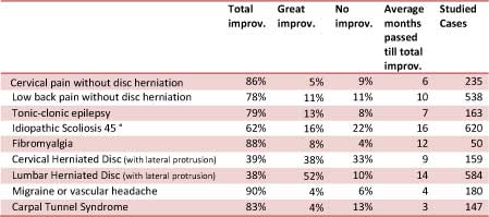 Here are the results of the studies. The initial follow up stage was done two months after treatment and the second was completed a year later. The ‘Total Improvement’ column above shows a significant improvement margin.
