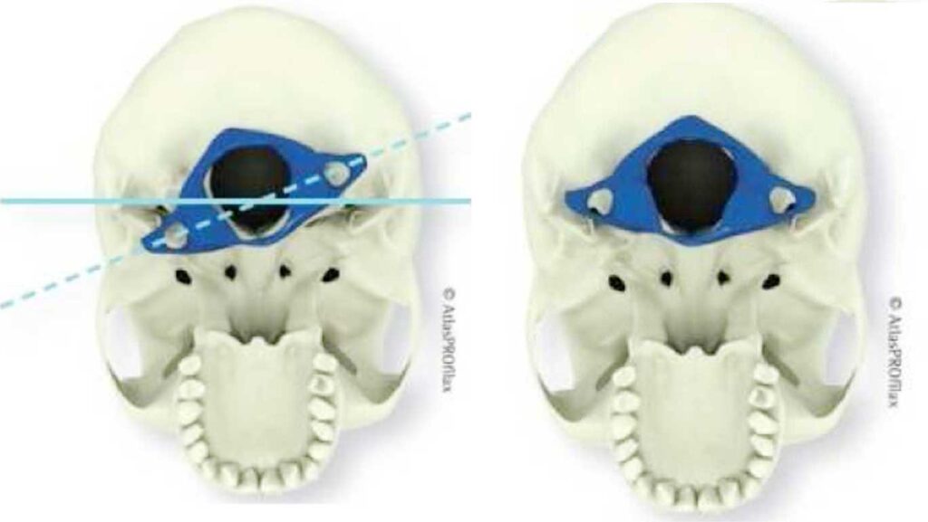 Here is a diagram by AtlasPROfilax® clearly demonstrating what the mal-rotation looks like (left) if one was looking at the atlas bottom up. The right diagram shows the correct position. 5